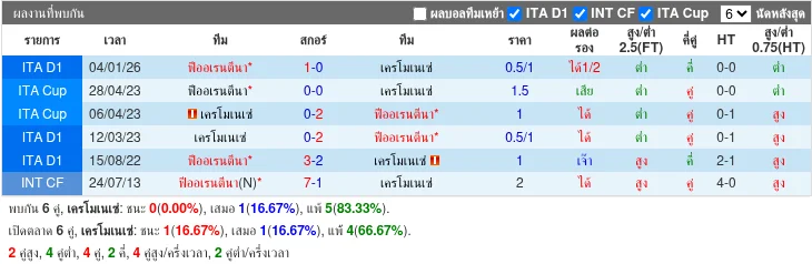 - 04/01/2026 | เซเรีย อา | ฟิออเรนติน่า vs เครโมเนเซ่ | 1 - 0 | ฟิออเรนติน่า ชนะ