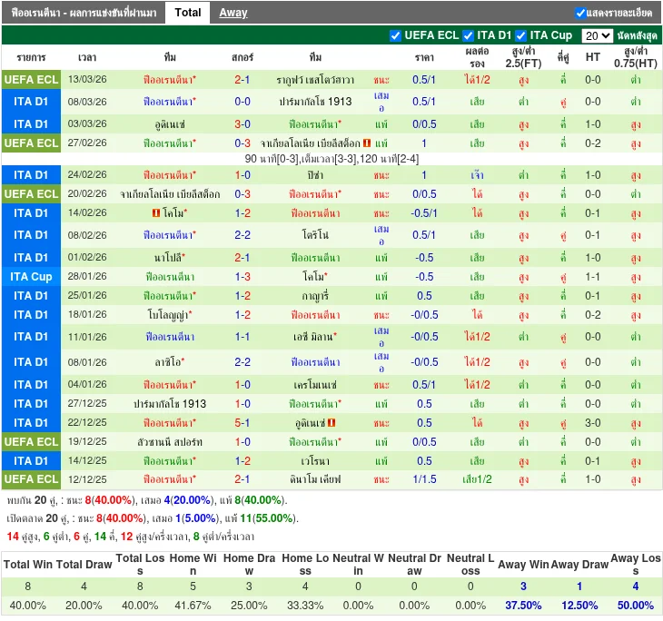 - 08/03/2026 | เซเรีย อา | ฟิออเรนติน่า vs ปาร์ม่า | 0 - 0 | เสมอ