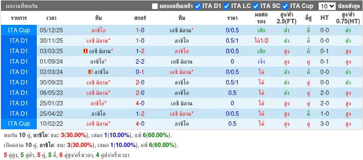 - 2026-03-09T19:45:00+00:00 | Serie A | ลาซิโอ vs ซัสซัวโล | 2 - 1 | ชนะ - 2026-03-04T20:00:00+00:00 | Coppa Italia | ลาซิโอ vs อตาลันต้า | 2 - 2 | เสมอ - 2026-03-01T17:00:00+00:00 | Serie A | โตริโน่ vs ลาซิโอ | 2 - 0 | แพ้ - 2026-02-21T19:45:00+00:00 | Serie A | กายารี่ vs ลาซิโอ | 0 - 0 | เสมอ - 2026-02-14T17:00:00+00:00 | Serie A | ลาซิโอ vs อตาลันต้า | 0 - 2 | แพ้