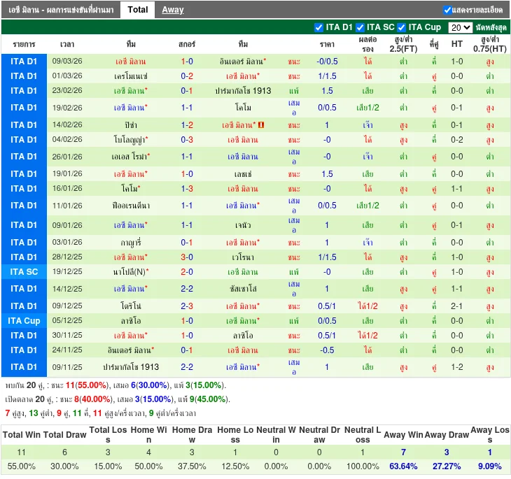 - 2026-03-01T11:30:00+00:00 | Serie A | เครโมเนเซ่ vs เอซี มิลาน | 0 - 2 | ชนะ
