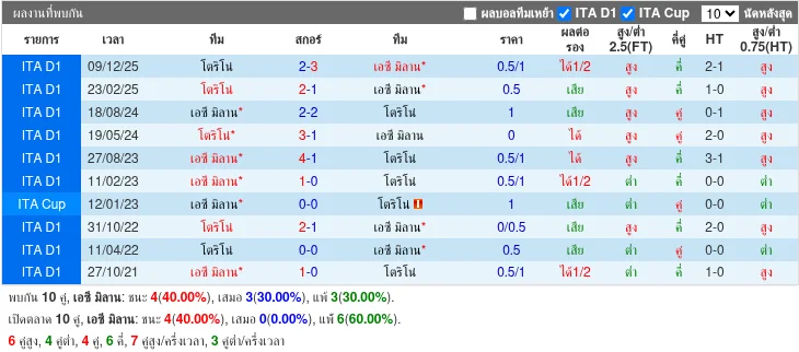 การพบกัน 5 นัดหลังผลออกมาใกล้เคียงกัน เสมอ 1 เอซี มิลานชนะ 2 โตริโน่ชนะ 2 ไม่มีทีมที่เหนือชั้นชัดเจน แต่เกมมักเปิดและมีสกอร์เกิดขึ้นบ่อย