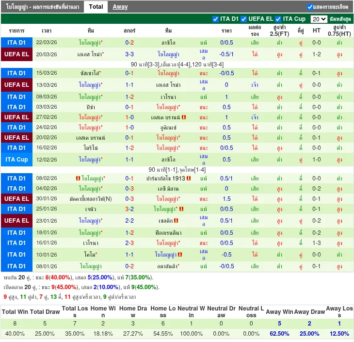 - 2026-03-22 | Serie A | Bologna vs Lazio | 0 - 2 | ชนะ - 2026-03-15 | Serie A | Sassuolo vs Bologna | 0 - 1 | ชนะ - 2026-03-12 | UEFA Europa League | Bologna vs AS Roma | 1 - 1 | เสมอ - 2026-03-08 | Serie A | Bologna vs Hellas Verona | 1 - 2 | แพ้ - 2026-03-02 | Serie A | Pisa vs Bologna | 0 - 1 | ชนะ