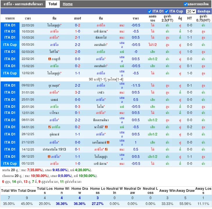 - 2026-03-22 14:00 | เซเรีย อา | โบโลญญา vs ลาซิโอ | 0 - 2 | แพ้
