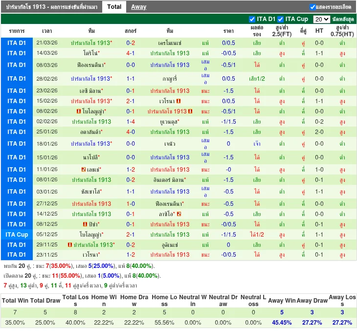 - 2026-03-21 14:00 | เซเรีย อา | พาร์ม่า vs เครโมเนเซ่ | 0 - 2 | แพ้