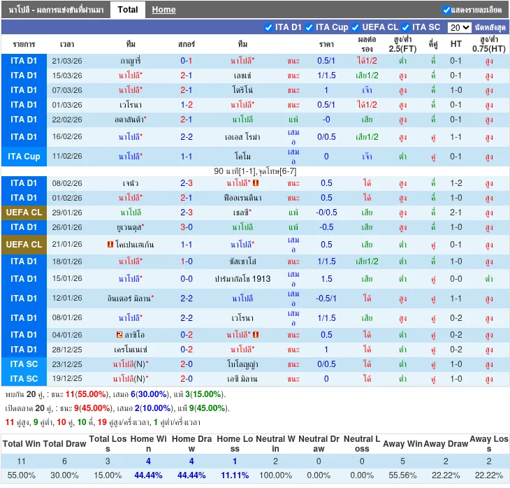 - 2026-03-20T17:30:00+00:00 | Serie A | คากลิอารี vs นาโปลี | 0 - 1 | นาโปลี ชนะ