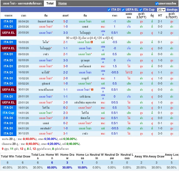 - 2026-04-05T18:45:00+00:00 | Serie A | อินเตอร์ มิลาน vs โรม่า | 5-2 | อินเตอร์ มิลาน ชนะ - 2026-03-22T17:00:00+00:00 | Serie A | โรม่า vs เลชเช่ | 1-0 | โรม่า ชนะ - 2026-03-15T17:00:00+00:00 | Serie A | โคโม (Como) vs โรม่า | 2-1 | โคโม ชนะ - 2026-03-12T17:45:00+00:00 | UEFA Europa League | โบโลญญา vs โรม่า | 1-1 | เสมอ - 2026-03-08T17:00:00+00:00 | Serie A | เจนัว vs โรม่า | 2-1 | เจนัว ชนะ