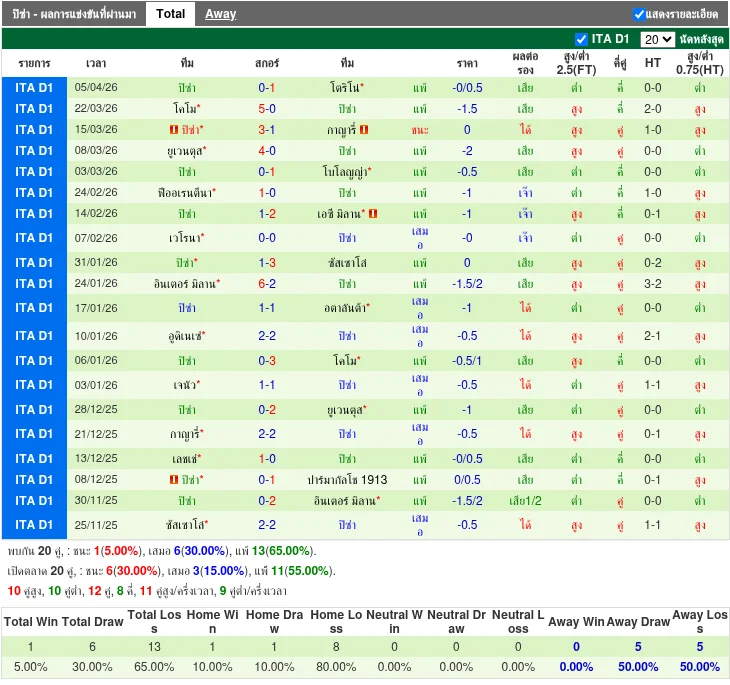 - 2026-04-05T16:00:00+00:00 | Serie A | ปิซ่า vs โตริโน | 0-1 | โตริโน ชนะ - 2026-03-22T11:30:00+00:00 | Serie A | โคโม vs ปิซ่า | 5-0 | โคโม ชนะ - 2026-03-15T14:00:00+00:00 | Serie A | ปิซ่า vs กัลยาร์รี่ | 3-1 | ปิซ่า ชนะ - 2026-03-07T19:45:00+00:00 | Serie A | ยูเวนตุส vs ปิซ่า | 4-0 | ยูเวนตุส ชนะ - 2026-03-02T17:30:00+00:00 | Serie A | ปิซ่า vs โบโลญญา | 0-1 | โบโลญญา ชนะ