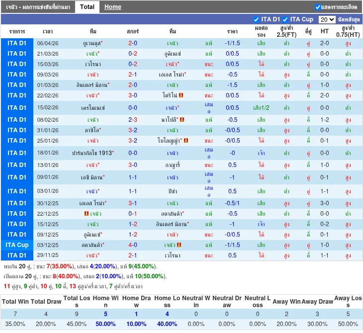 - 2026-03-20T19:45:00+00:00 | Serie A | Genoa vs Udinese | 0-2 | แพ้