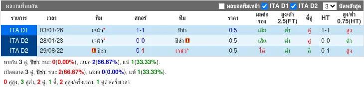 - 2026-01-03T14:00:00+00:00 | Serie A | Genoa vs Pisa | 1-1 | เสมอ - 2023-01-28T15:15:00+00:00 | Serie B | Genoa vs Pisa | 0-0 | เสมอ - 2022-08-28T18:45:00+00:00 | Serie B | Pisa vs Genoa | 0-1 | ชนะ