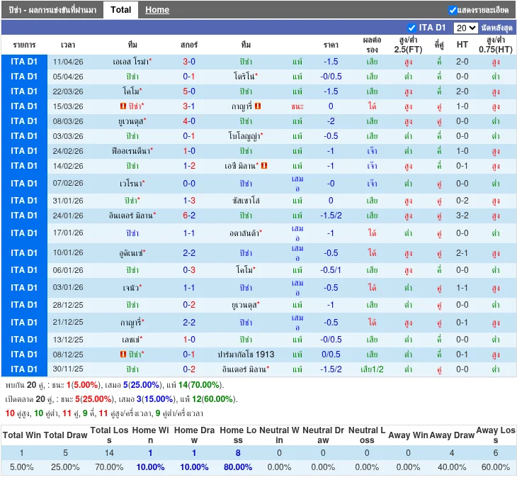- 2026-04-05T16:00:00+00:00 | Serie A | Pisa vs Torino | 0-1 | แพ้