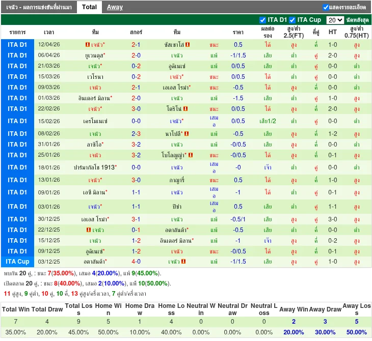- 2026-03-20T19:45:00+00:00 | Serie A | Genoa vs Udinese | 0-2 | แพ้