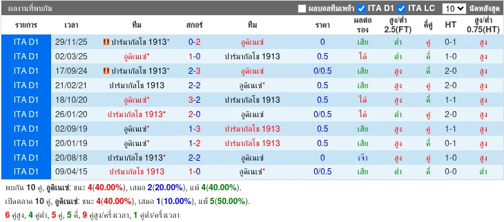 - 2025-11-29T14:00:00+00:00 | Serie A | Parma vs Udinese | 0 - 2 | Udinese - 2025-03-01T19:45:00+00:00 | Serie A | Udinese vs Parma | 1 - 0 | Udinese - 2024-09-16T16:30:00+00:00 | Serie A | Parma vs Udinese | 2 - 3 | Udinese - 2021-02-21T11:30:00+00:00 | Serie A | Parma vs Udinese | 2 - 2 | เสมอ - 2020-10-18T16:00:00+00:00 | Serie A | Udinese vs Parma | 3 - 2 | Udinese