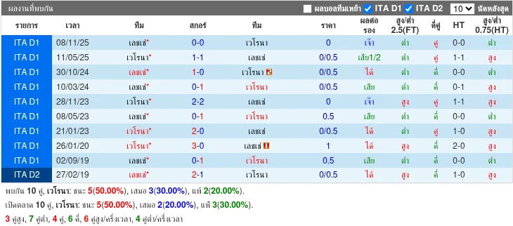 - 2025-11-08 | Serie A | ลีเช่ vs เวโรนา | 0 - 0 | เสมอ - 2025-05-11 | Serie A | เวโรนา vs ลีเช่ | 1 - 1 | เสมอ - 2024-10-29 | Serie A | ลีเช่ vs เวโรนา | 1 - 0 | ลีเช่ - 2024-03-10 | Serie A | ลีเช่ vs เวโรนา | 0 - 1 | เวโรนา - 2023-11-27 | Serie A | เวโรนา vs ลีเช่ | 2 - 2 | เสมอ