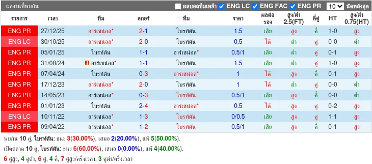 เจอกัน 5 ครั้งหลัง อาร์เซน่อลเหนือกว่า ชนะ 3 เสมอ 2 ไบรท์ตันไม่ชนะเลย ผลต่างประตูรวมชี้ชัดว่าอาร์เซน่อลมีความได้เปรียบทั้งเกมรุกและความมั่นคงในเกมใหญ่