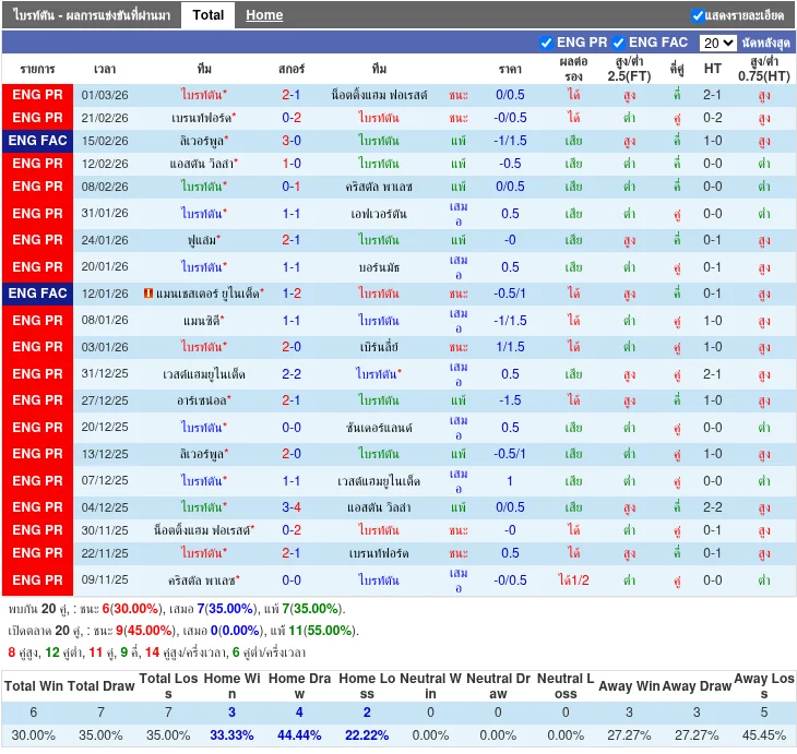 ฟอร์มทีมเหย้า: ไบรท์ตัน