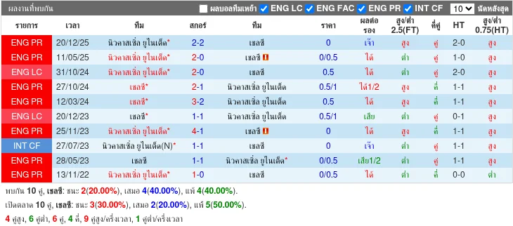 5 นัดหลังที่พบกันสมดุล: เชลซีชนะ 2, นิวคาสเซิลชนะ 2, เสมอ 1 เกมส่วนใหญ่ผลใกล้เคียงและมีสกอร์ค่อนข้างสูง ชี้ว่าคู่แข่งมักเปิดเกมสู้และมีจังหวะทำประตูทั้งสองฝั่ง