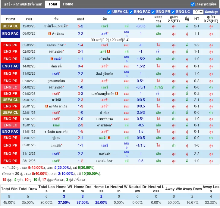 - 2026-03-11T20:00:00+00:00 | ยูฟ่า แชมเปียนส์ ลีก | ปารีส แซงต์ แชร์กแมง vs เชลซี | 5 - 2 | แพ้
