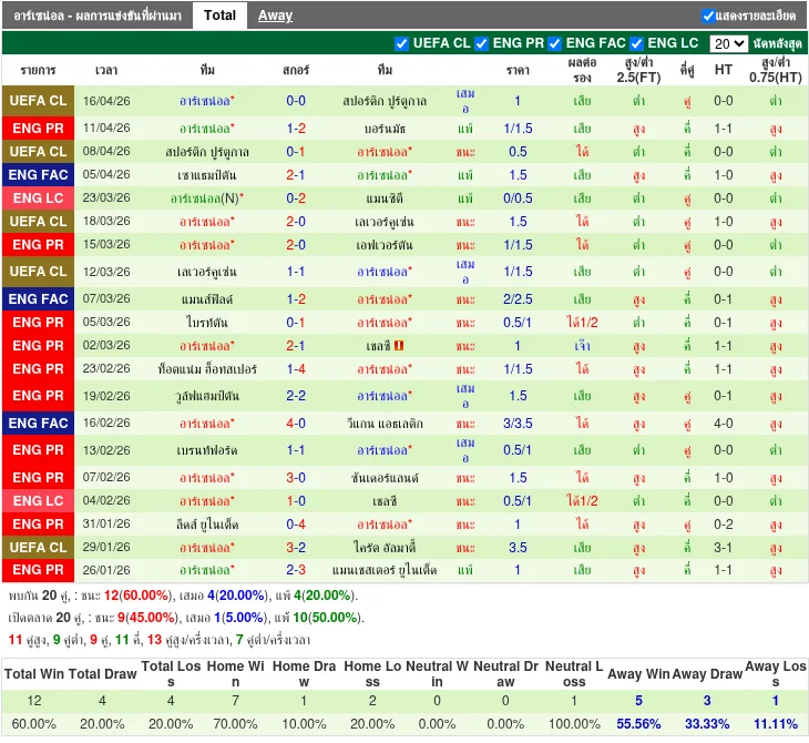 - 2026-04-15 19:00 | UEFA Champions League | Arsenal - Sporting CP | 0 - 0 | เสมอ - 2026-04-11 11:30 | Premier League | Arsenal - Bournemouth | 1 - 2 | Bournemouth - 2026-04-07 19:00 | UEFA Champions League | Sporting CP - Arsenal | 0 - 1 | Arsenal - 2026-04-04 19:00 | FA Cup | Southampton - Arsenal | 2 - 1 | Southampton - 2026-03-22 16:30 | League Cup | Arsenal - Manchester City | 0 - 2 | Manchester City