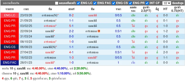 - 2026-03-22 16:30 | League Cup | Arsenal - Manchester City | 0 - 2 | Manchester City - 2025-09-21 15:30 | Premier League | Arsenal - Manchester City | 1 - 1 | เสมอ - 2025-02-02 16:30 | Premier League | Arsenal - Manchester City | 5 - 1 | Arsenal - 2024-09-22 15:30 | Premier League | Manchester City - Arsenal | 2 - 2 | เสมอ - 2024-03-31 15:30 | Premier League | Manchester City - Arsenal | 0 - 0 | เสมอ