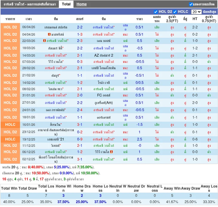 - 2026-04-06T10:15:00+00:00 | Eerste Divisie | Helmond Sport vs Waalwijk | 2-2 | เสมอ - 2026-04-03T18:00:00+00:00 | Eerste Divisie | MVV vs Waalwijk | 1-3 | Waalwijk ชนะ - 2026-03-21T19:00:00+00:00 | Eerste Divisie | Waalwijk vs Den Bosch | 2-3 | Den Bosch ชนะ - 2026-03-17T19:00:00+00:00 | Eerste Divisie | Almere City FC vs Waalwijk | 2-2 | เสมอ - 2026-03-13T19:00:00+00:00 | Eerste Divisie | Waalwijk vs Jong AZ | 2-1 | Waalwijk ชนะ