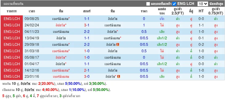 สถิติพบกัน 5 นัดล่าสุด มักจบด้วยผลเสมอมากกว่า มีหนึ่งเกมที่อิปสวิชชนะในปี 2024 และอีกหลายเกมที่ผลออกมาเสมอ ทำให้คู่นี้ดูมีความสูสีและทายผลยากแต่มักเปิดเกมรุกสูงเมื่อเจอทีมเยือน
