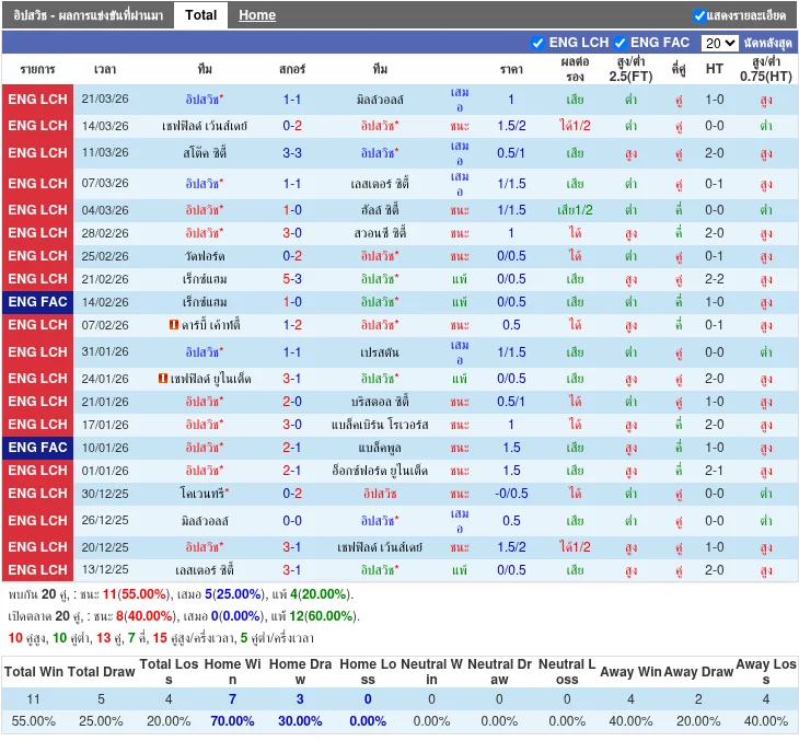 - 2026-03-07T15:00:00+00:00 | แชมเปี้ยนชิพ | อิปสวิช vs เลสเตอร์ ซิตี้ | 1 - 1 | เสมอ