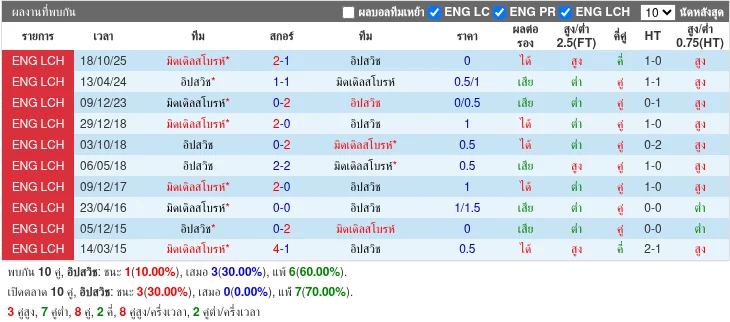 สถิติการพบกัน 5 นัดล่าสุด มิดเดิลสโบรห์ ชนะ 3 ครั้ง เสมอ 1 ครั้ง อิปสวิช ชนะ 1 ครั้ง