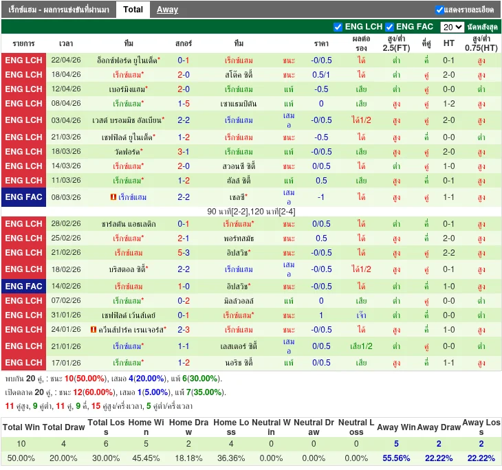 - 2026-04-18 | Championship | เวร็กซ์แฮม เอฟซี vs สโต๊ค ซיטי | 2-0 | เวร็กซ์แฮม เอฟซี