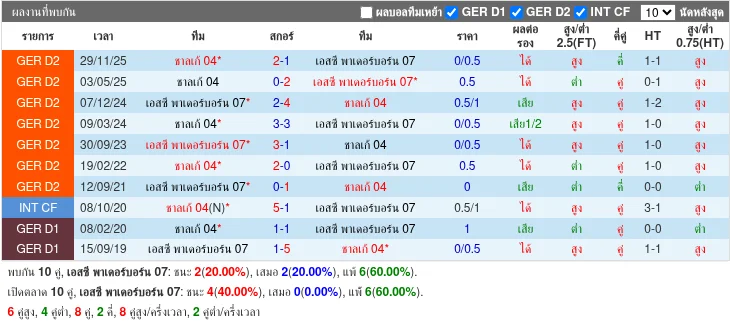 สถิติพบกัน 5 นัดล่าสุด Schalke 04 ชนะ 2 เสมอ 1 แพ้ 2; SC Paderborn 07 ชนะ 2 เสมอ 1 แพ้ 2