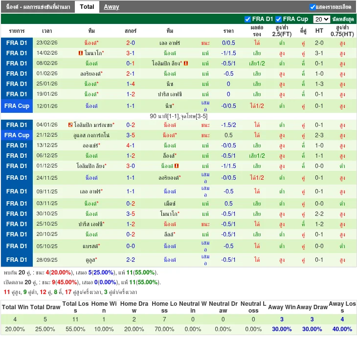 - 2026-02-22 | ลีกเอิง | น็องต์ vs เลอ อาฟร์ | 2 - 0 | น็องต์ ชนะ