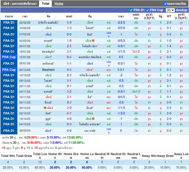 - 2026-02-06 | ลีก เอิง | เม็ตซ์ vs ลีลล์ | 0 - 0 | เสมอ