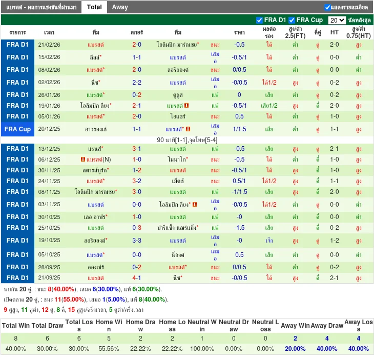 - 2026-02-20 | ลีก เอิง | แบรสต์ vs มาร์กเซย | 2 - 0 | แบรสต์ ชนะ