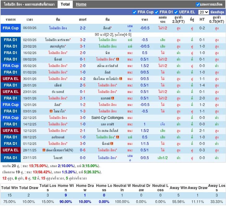 - 2026-03-01 | ลีก เอิง | มาร์กเซย vs โอลิมปิก ลียง | 3 - 2 | แพ้