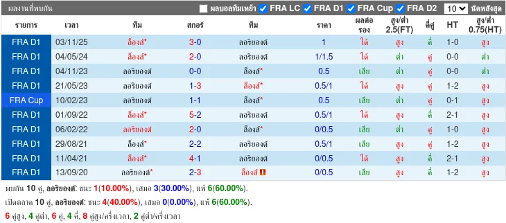 ล็องส์เหนือกว่าใน H2H 5 นัดหลังสุด ชนะ 4 เสมอ 1 มักชนะด้วยผลต่างพอสมควรและมีสกอร์รวมสูงหลายครั้ง แสดงถึงความได้เปรียบเมื่อต้องเจอโลริยง