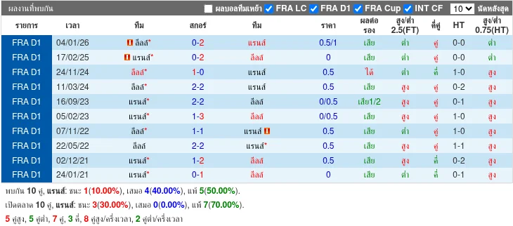 5 นัดหลังพบกัน ลีลล์ชนะ 2 แรนส์ชนะ 1 เสมอ 2 แม้โดยรวมลีลล์จะมีผลลัพธ์เหนือกว่า แต่แมตช์ล่าสุด (ม.ค.2026) แรนส์บุกชนะลีลล์ 2-0 แสดงให้เห็นความได้เปรียบของแรนส์ในเกมบางนัด