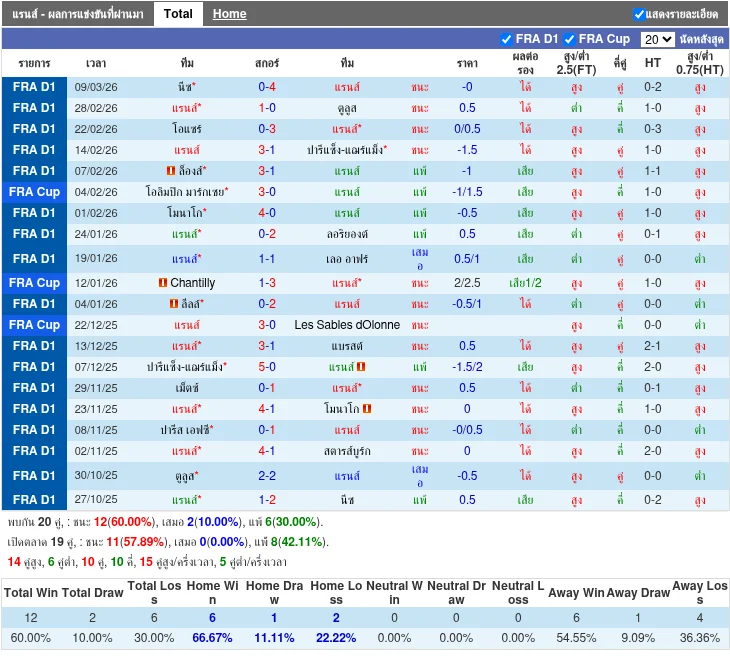 - 2026-03-08 | ลีก เอิง | นีซ vs แรนส์ | 0 - 4 | แรนส์ ชนะ
