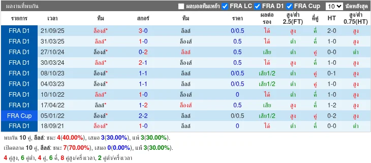 - 2025-09-20 | Ligue 1 | Lens vs Lille | 3 - 0 | Lens ชนะ - 2025-03-30 | Ligue 1 | Lille vs Lens | 1 - 0 | Lille ชนะ - 2024-10-26 | Ligue 1 | Lens vs Lille | 0 - 2 | Lille ชนะ - 2024-03-29 | Ligue 1 | Lille vs Lens | 2 - 1 | Lille ชนะ - 2023-10-08 | Ligue 1 | Lens vs Lille | 1 - 1 | เสมอ