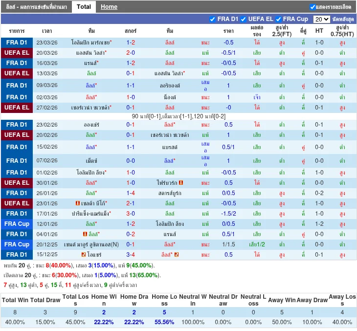 - 2026-03-08 | Ligue 1 | Lille vs Lorient | 1 - 1 | เสมอ