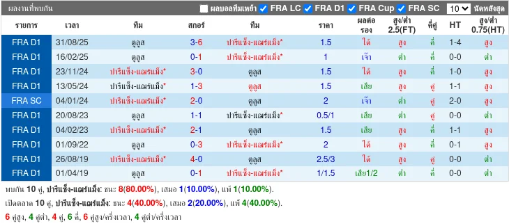 สถิติพบกัน 5 นัดล่าสุด PSG เหนือกว่าอย่างชัดเจน โดย PSG ชนะ 4 ครั้ง และ ทูลูซ ชนะ 1 ครั้ง