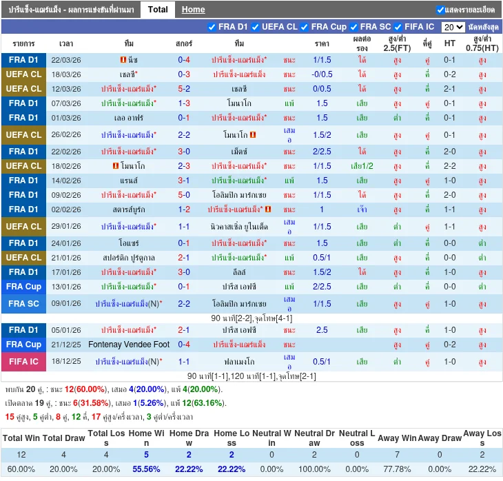 - 2026-03-21T20:05:00+00:00 | Ligue 1 | นีซ vs ปารีส แซงต์-แชร์กแมง | 0 - 4 | แพ้