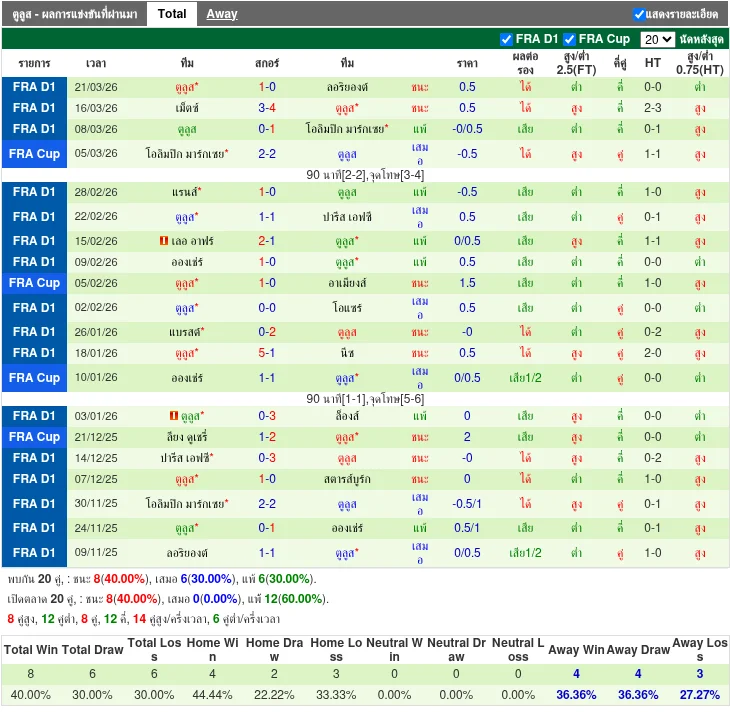 - 2026-03-21T16:00:00+00:00 | Ligue 1 | ทูลูซ vs ลอริยงต์ | 1 - 0 | แพ้