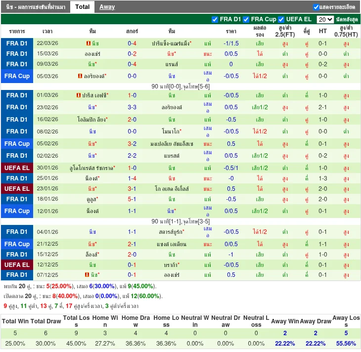 - 2026-03-08 | Ligue 1 | นีซ - แรนส์ | 0 - 4 | แรนส์ ชนะ