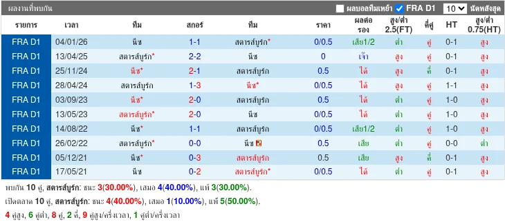 การพบกัน 5 นัดล่าสุดระหว่าง นีซ กับ สตราสบูร์ก นีซ ชนะ 3 เสมอ 2 สตราสบูร์ก ชนะ 0