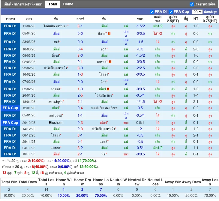 - 2026-04-05 | Ligue 1 | เม็ตซ์ vs น็องต์ | 0-0 | เสมอ