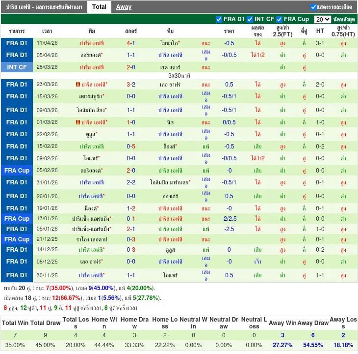- 2026-04-05 | Ligue 1 | Lorient vs Paris FC | 1-1 | เสมอ