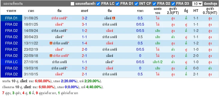 - 2025-08-31 | Ligue 1 | Paris FC vs Metz | 3-2 | Paris FC - 2025-01-18 | Ligue 2 | Metz vs Paris FC | 3-1 | Metz - 2024-09-14 | Ligue 2 | Paris FC vs Metz | 1-2 | Metz - 2023-04-29 | Ligue 2 | Metz vs Paris FC | 1-1 | เสมอ - 2022-11-12 | Ligue 2 | Paris FC vs Metz | 1-4 | Metz