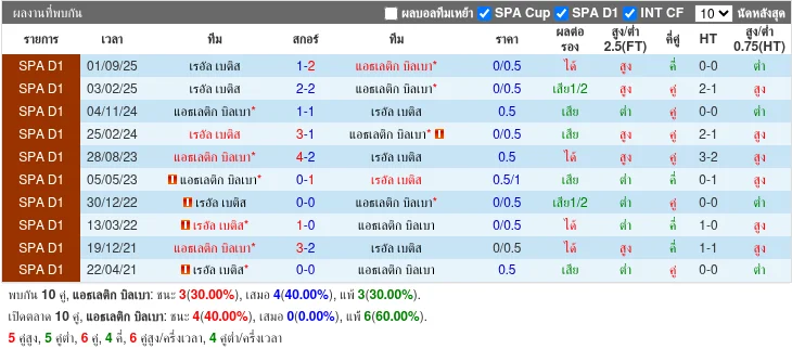 5 นัดหลังที่พบกัน แอธเลติก บิลเบา ชนะ 2, เรอัล เบติส ชนะ 1, เสมอ 2; ส่วนใหญ่เป็นเกมที่สูสี บางนัดมีสกอร์ค่อนข้างสูง แต่ก็มีหลายแมตช์ที่ผลเสมอได้เห็นความเหนียวแน่นของทั้งสองฝ่าย