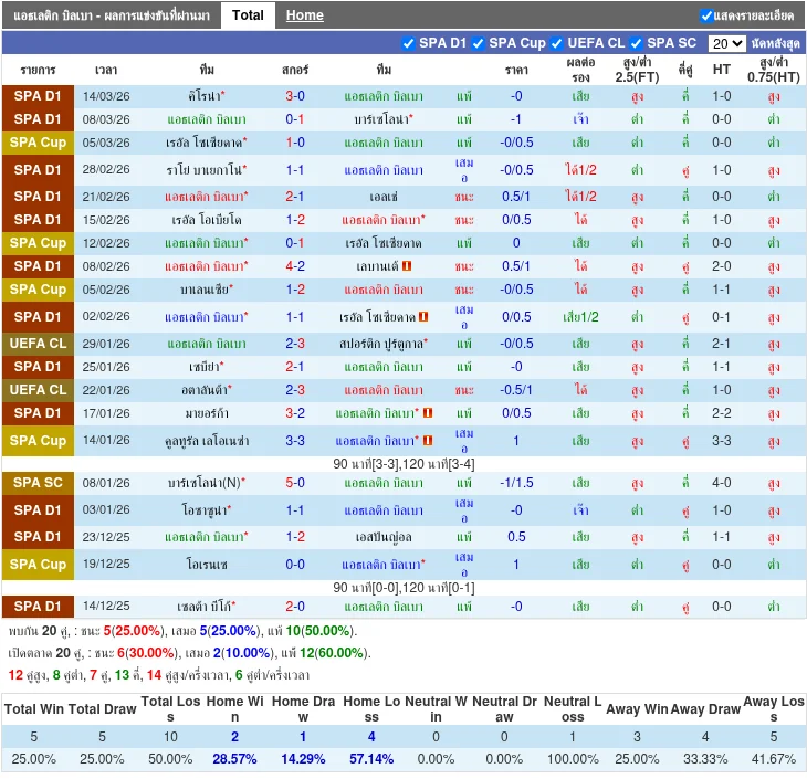- 2026-02-20 | ลาลีกา | แอธเลติก บิลเบา vs เอลเช่ | 2 - 1 | ชนะ