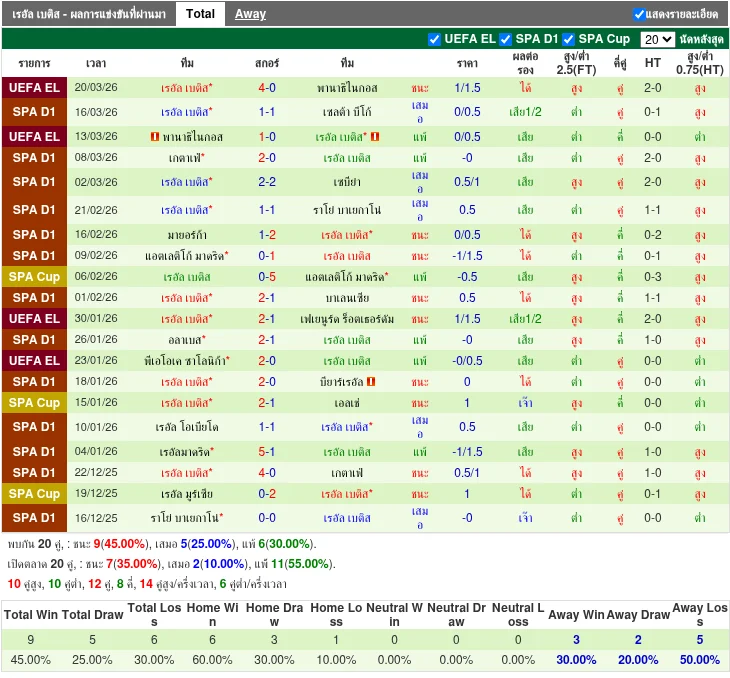เรอัล เบติส 5 นัดหลัง: ชนะ 1 เสมอ 2 แพ้ 2; ยิงรวม 7 ประตู เสีย 6 ประตู ทีมมีความสามารถทำประตูแต่ยังไม่สม่ำเสมอโดยเฉพาะเกมเยือนที่แพ้จากความผิดพลาดให้เห็น