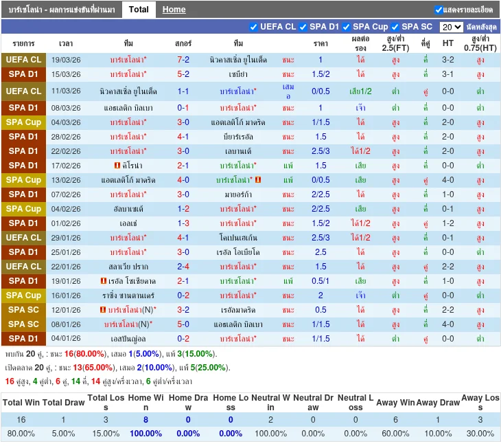 - 2026-03-07 | La Liga | แอธเลติก บิลเบา vs บาร์เซโลน่า | 0 - 1 | ชนะ